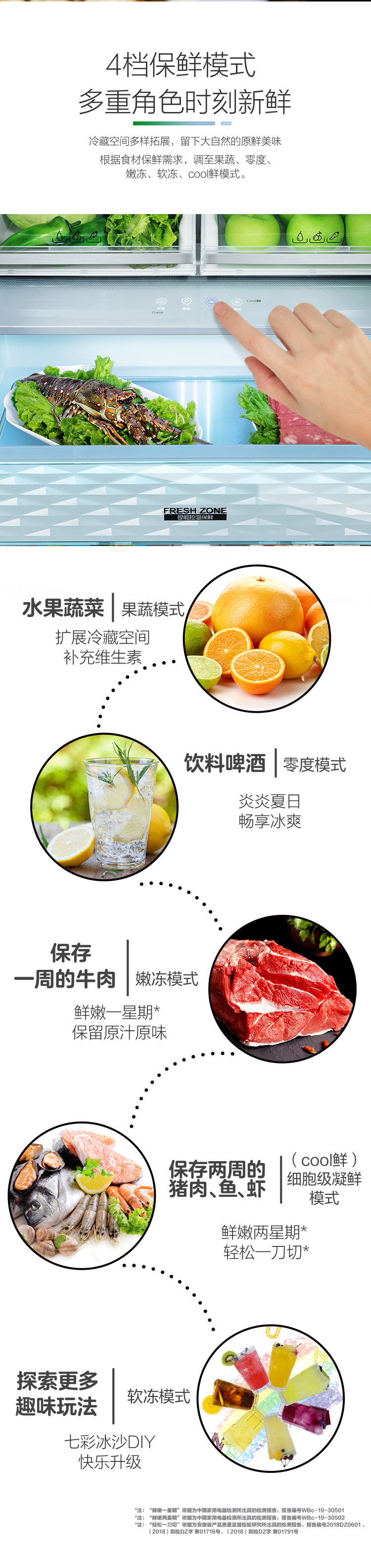 搭載-5℃嫩凍凝鮮科技,鮮嫩兩星期,輕松一刀切。Plasma等離子除菌凈味,除菌保鮮,長久新鮮。4檔保鮮模式,多重角色時刻新鮮。